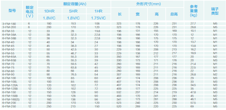 在20℃環(huán)境下,F(xiàn)M系列小型密封電池浮充壽命可達(dá)3~5年,F(xiàn)M固定型密封電池浮充壽命可達(dá)8~10年,F(xiàn)ML系列電池浮充壽命可達(dá)10年,F(xiàn)MH系列電池浮充壽命可達(dá)10年,GFM系列、太陽(yáng)能深循環(huán)系列電池浮充壽命可達(dá)15年,GFMJ系列電池浮充壽命可達(dá)18年。