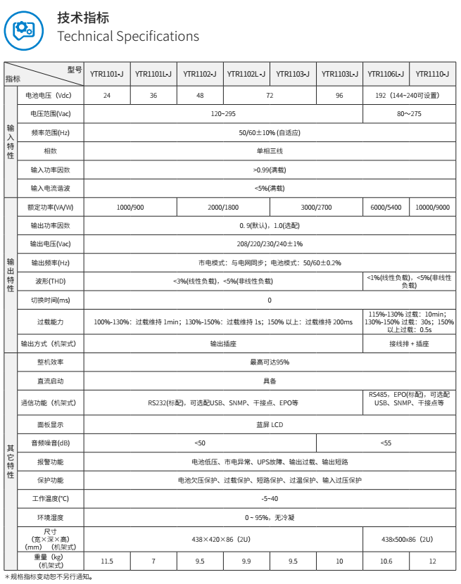 通訊功能標配RS232/RS485,可支持USB、SNMP、干接點、EPO 等。